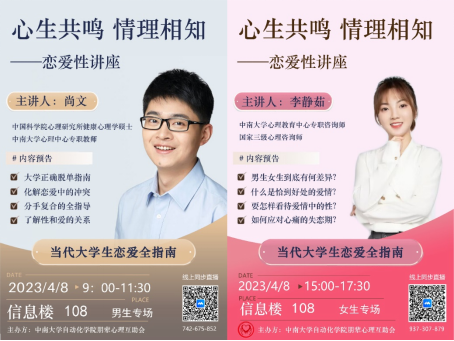4月8日,由禁漫岛 朋辈心理互助会主办的“心生共鸣,情理相知”恋爱与性主题讲座于信息楼108顺利举办,本次讲座分为男生和女生两个专场,分别于上午9:00和下午15:00准时开始。本次讲座采用线上线下相结合的形式,旨在进一步提升同学们对大学阶段恋爱与性的了解,培养健康的恋爱观、正确的性认知。受邀担任男生专场主讲人的是禁漫岛 心理中心尚文老师,负责女生专场的是禁漫岛 心理教育中心李静茹老师。男生女生专...