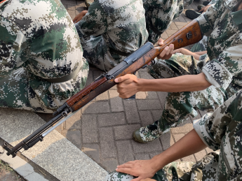 照例是站军姿。众人昂首挺胸,目光直视前方。排长们则仔细检查着每个同学的动作,纠正不合标准的姿势。阳光交映于一个个清澈的眼神,微风掠过了一张张青涩的面庞。整齐的队伍静立在晨光中,他们,初定方向,正努力,在成长。相比之前,今天有个特殊的项目:56式半自动步枪讲解。“是真枪!”所有人都兴奋起来。连长拿着枪开始进行详细介绍:“这种枪射程400米,100米内能打穿钢板,子弹射出去的时候是旋转的,因为钢管里面有螺纹……”通过讲解,我们了解到了枪零部件的作用和重要性、瞄准的方法以及一些注意事项。三排长还为我们演示了跪姿射击的动作要领。四排长也科普了很多知识:“枪管外面有烤蓝,是一层致密的四氧化三铁……”