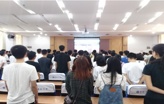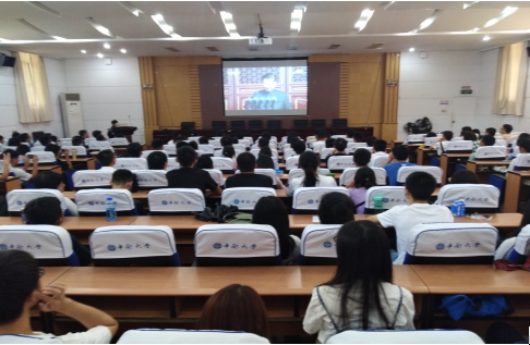 组织部分在校学生齐聚民主楼小礼堂收看中华人民共和国成立七十周年庆祝大会和阅兵式直播。参加本次活动的有学院学工办辅导员向勇、刘海澍、杨金鑫三位老师以及200余名国庆假期留校研究生、本科生。