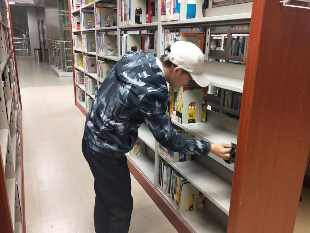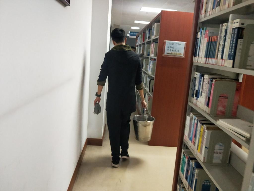 伴随着长沙秋季的绵绵细雨,同志们早上8点就在新校区图书馆门口集合。经图书馆工作人员的指导示范后,他们开始了图书馆志愿服务工作。在图书馆二楼,能看到他们穿梭于书架间的身影,提桶打水、擦拭书架、整理书籍,每一个细小动作的背后都是对“为人民服务”的真切实践。