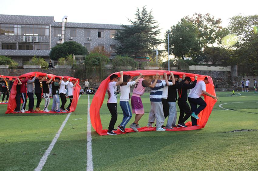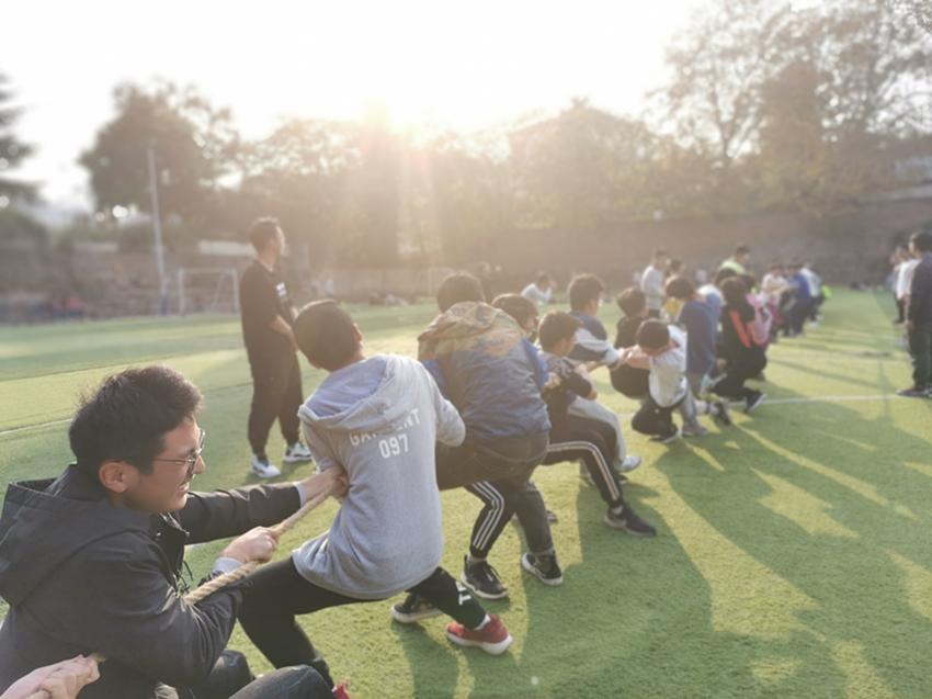 随后是颇考验体力与技术的拔河比赛。一声哨响,所有人的目光都集中在绳中心那一抹红。兴奋的氛围随着每厘米的偏移水涨船高。此刻,胜负决于一念之间,他们拼尽全力。未到最终,不轻言弃。那一刻,阳光撒肩头,仿佛光阴暂住。