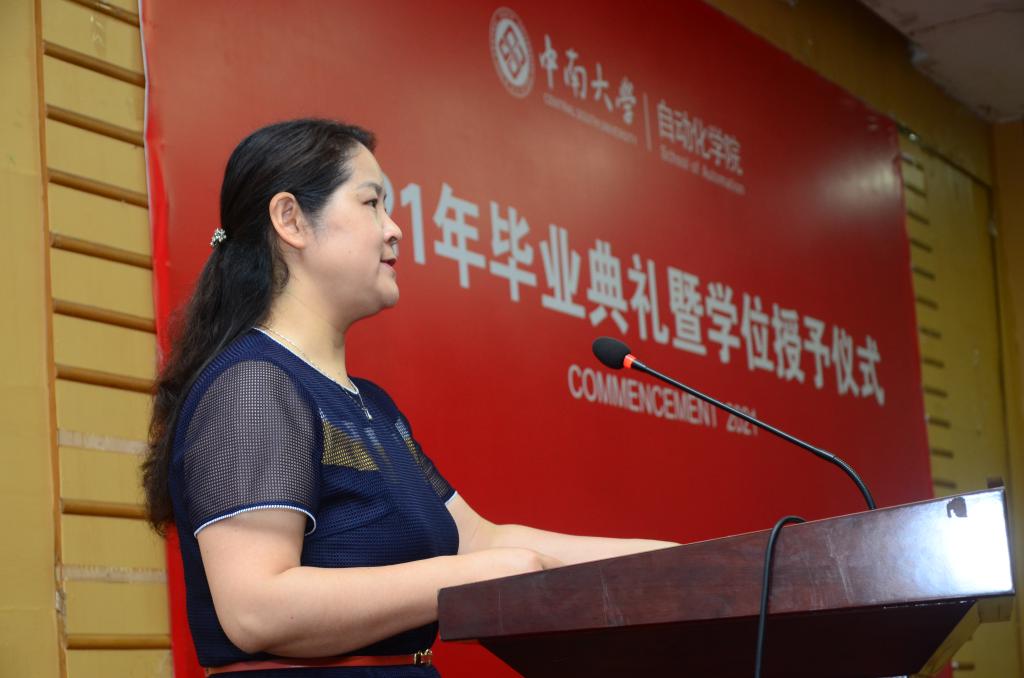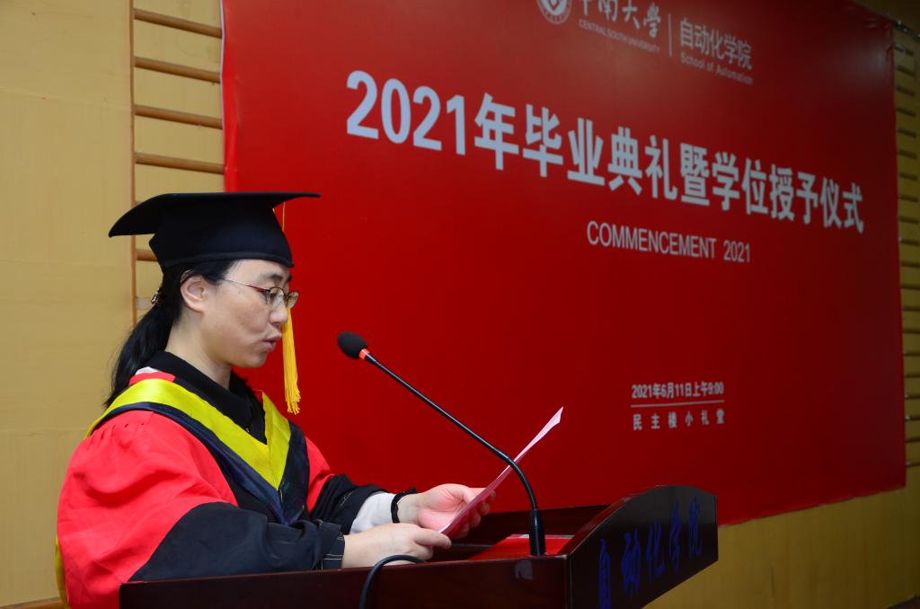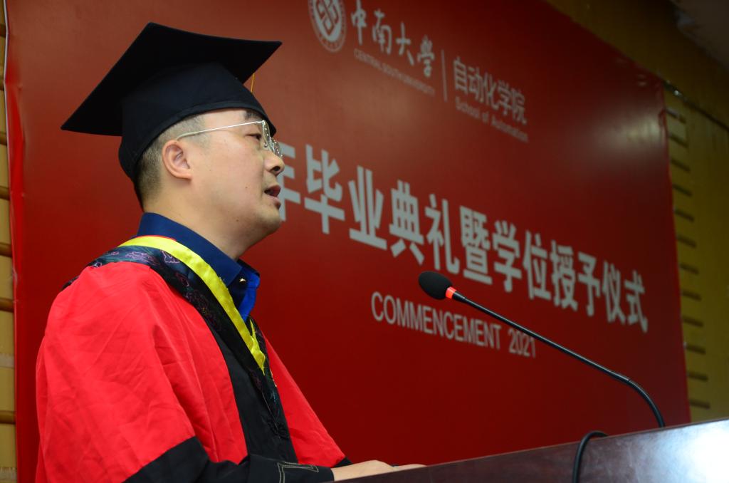 蒋朝辉教授作为教师代表,阳春华院长代表学院先后致辞。蒋朝辉教授回顾了自己在民主楼度过的求学时光和追梦之旅经历,希望学生们在今后的道路中秉承民主楼的文化精神去工作和生活。阳春华院长对毕业生们表达了真挚的祝贺同时也表示今年恰逢中国共产党建党100周年,在这个特殊的节点毕业,她希望学生们能深刻理解其背后的时代要求与使命,并提出了三点具体要求,第一是要求学生们要热爱伟大祖国,勇担时代责任。第二要牢记“知行合一,经世致用”校训,发扬中南品格。第三要增强学习紧迫感,保持终身学习的好习惯。