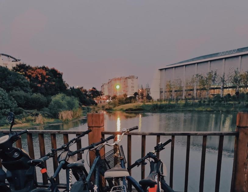 归途路过绿波微漾的湖水,水波温柔地注视和抚慰着疲劳的小青蛙们,将白日的苦揉碎进平静的水面,橙色的灯光映在水面,透出丝丝暖意,为这一天画上优美的句号。