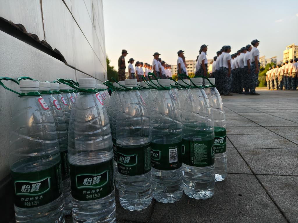 训练间隙,新生们的“水瓶阵”成了别样风景。哨声一响,大家将水瓶拉环内扣、姓名贴朝外、瓶身对齐,沿训练场边缘排得笔直。军训总教官说,这些“小事”都是作风养成课,打磨细节既能练队列素养,更能让新生在潜移默化中养成严于律己的品质。