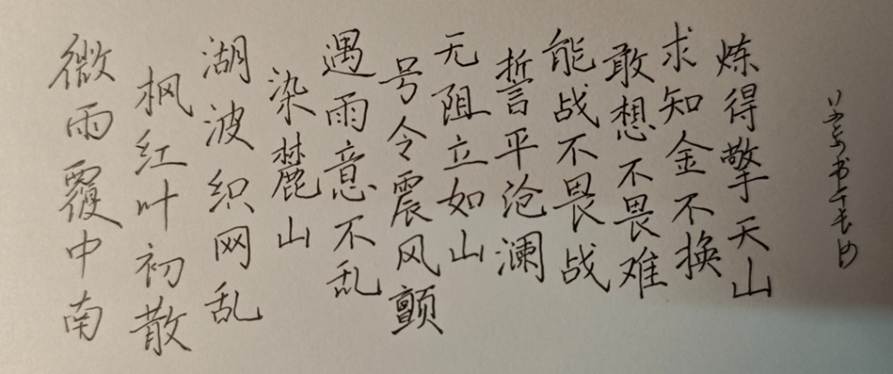 笔落惊风雨,墨染军魂色!训练间隙疾书的“自强不息”、晚霞之下劲书的“保家卫国”,非寻常笔墨,而是迷彩少年以笔为枪刻进岁月的铁血誓言——让军训炽热有了厚重承载,让青春锋芒化作传世墨章。这纸磅礴气韵当为征途号角:愿学子以笔绘山河、以志护家国,让笔墨赤诚与军训担当,永在时代浪潮中奔涌!