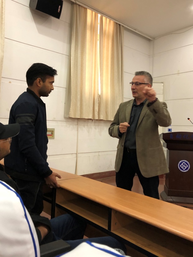 在互动环节,与会老师和同学不仅对讲座涉及到的相关专业知识进行了提问,而且对赴西班牙大学留学情况也表现出极高的热情及兴趣,无论什么问题,Francisco教授都逐一耐心解答,情到浓时,他还直接走下讲台来到同学身边,直接互动交流。Francisco教授带着西班牙口音的英语和同学们的中式英语丝毫没影响到中西双方的交流,反而给会场添加出别样风情,现场不时爆出掌声和笑声,整个报告会现场气氛热烈而且有序。