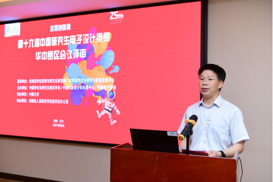 中国研究生电子设计竞赛组委会秘书长李德识教授讲话。他首先对各位专家对研究生电子设计竞赛的支持表示感谢。紧接着,李秘书长指出,如今电子信息技术发展迅速,学科交叉和社会需求对电子技术提出更高要求。为扩大学科影响,推动拔尖创新研究生教育,希望各位专家严格按照大赛工作规则和工作程序开展工作。他同时表示,在评审工作中,应当以培养研究生的创新能力、实践能力和解决问题能力为出发点,重点考核学生完成工作的独立性以及解决复杂问题的能力。希望评审专家可以在500余支队伍中,评审出具有代表性的优秀作品,以全面展现华中赛区的风貌和水平。