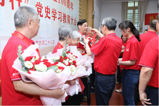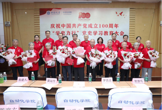 在欢快的《欢迎进行曲》中,桂卫华院士、王一军书记、阳春华院长、黄亚副书记为到会的10位老同志佩戴纪念章,送上慰问金,全体院领导为老同志献上鲜花。聚光灯下的鲜亮纪念章,是一辈辈老党员们披荆斩棘,筚路蓝缕,永担初心使命的闪光回答。