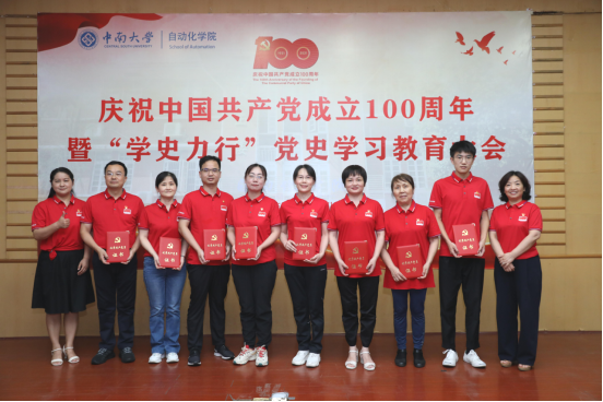 欢快的音乐再次响起。桂卫华院士、王一军书记、阳春华院长、黄亚副书记为来自教工支部、离退休支部和学生支部的8名优秀共产党员颁发荣誉证书。