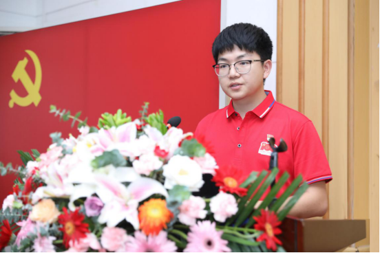 学生党员代表刘博文同学发言。他讲到,当今世界格局的特点是多元化、竞争强。科技打压、战略围堵,现在的中华民族面对着更加艰巨的挑战。但就是在这样的困境之下,党领导全国人民,取得了蛟龙潜水、嫦娥飞天、东风快递、天宫在建等一系列举世瞩目的成就。青年一代正在逐渐成长为国家科技进步的中坚力量。他表示,作为一名研究生党员,要把探寻学科前沿知识与社会实际问题结合起来,要奔走在以所学反哺回馈社会的锤炼之路上。在参加了系列党课及实践学习之后,他明确了将扎根基层作为自己未来的发展方向,誓将用实际行动奉献社会。