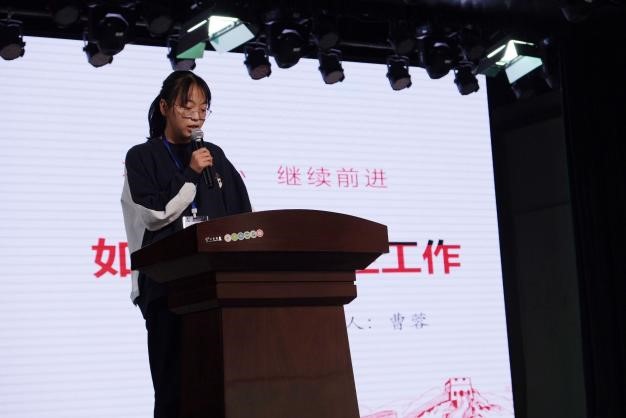 大会第一项内容是由学生会主席曹蓉为团学会成员讲解如何做好学生工作。曹主席在发言中提出了团学会要各司其职,密切配合,组织好院内各种活动,使团学会再创佳绩。同时她也表达了对新加入的干事们的鼓励和期盼。大会第二项内容是团委书记陶卓敏老师讲话。她提出希望团学会成员友好相处,团结一致。同时提醒每一位团学会成员要明确自己的目标,服务同学的同时提升自己的能力。最后表达了她对团学会全体成员的祝愿和期待,希望团学会每个成员都能度过一个充实的学年。