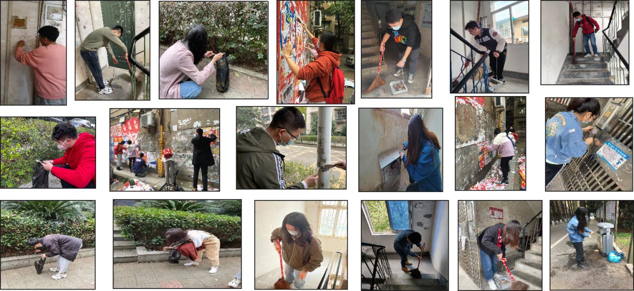 校园内进行居民区清扫楼道、清除“牛皮癣”、美化社区环境等。这是继学术活动担任志愿者、公共事务义务帮忙、求职写作经验分享等活动之后,党支部进行的党史学习见行动、我为群众办实事的系列活动之一。