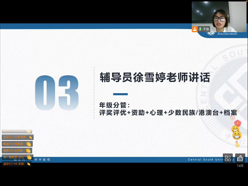 2021级线上年级大会顺利召开。2021级辅导员刘乐老师、徐雪婷老师及2021级全体同学参加本次大会,会议由徐雪婷老师主持。
