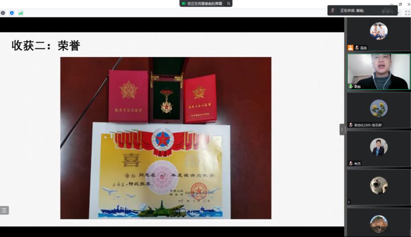 于线上召开2023年大学生应征入伍宣讲会,学院党委副书记黄亚,国防教育专干连选出席会议,优秀退役大学生士兵代表谢彪、戴勇军、胡铭欣三位同学以及部分本科生、学生家长参会。会议由连选老师主持。