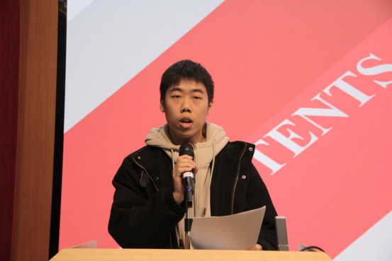 研究生会主席马润洲作研究生会述职报告。报告主要从本领建设和学生服务两大板块进行述职,并总结了研究生会的主要成绩,表示会继续提高能力更好为同学们服务。