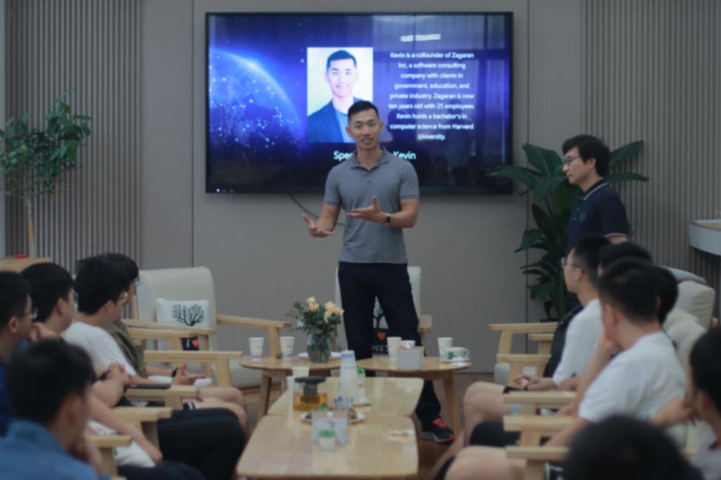 Kevin(本科毕业于哈佛大学,现为Zagaran公司联合创始人)介绍了近几年人工智能技术的迅猛发展及其在各行各业的应用,为大家介绍了其创业公司Zagaran的主要业务,还就校企深度交流合作与大家进行了讨论,提出了自己的见解和看法。