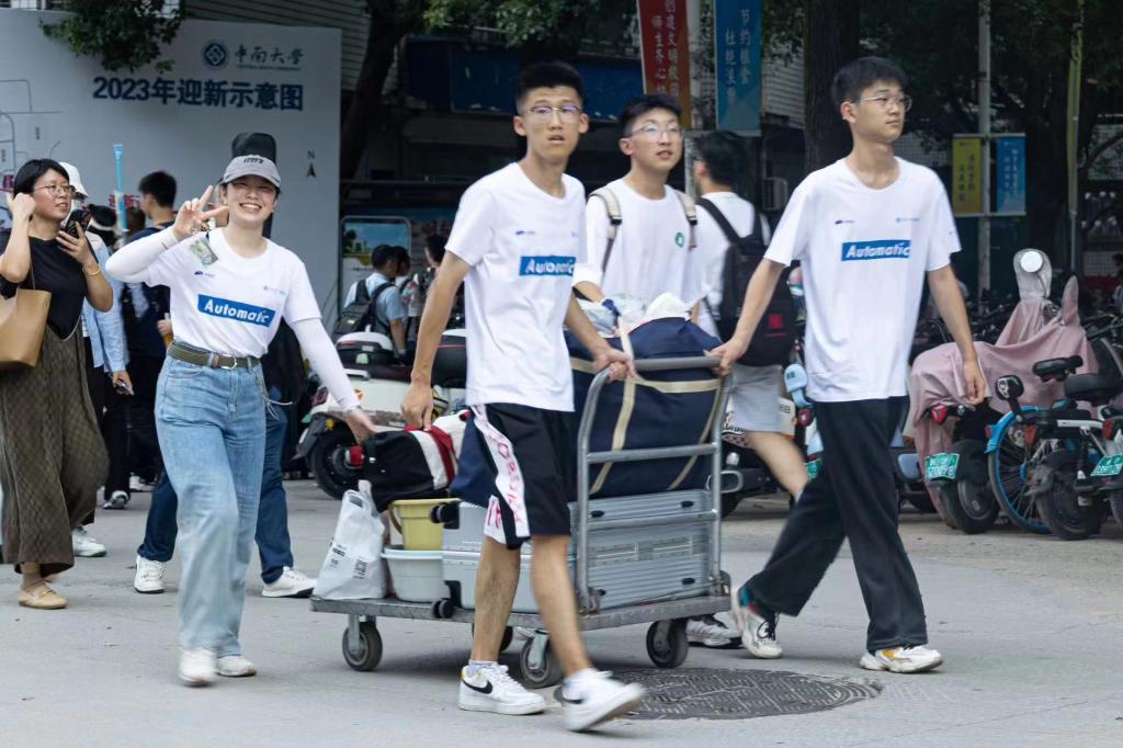 在宿舍楼下服务点,志愿者提醒新生入学注意事项,引导新生在宿舍楼下进行签到,并将行李搬送至宿舍门口。学院为2023级新生准备了礼物,分别是原创设计的校园卡卡套和文化衫。文化衫正面为Automation的学院logo,背面为代表学院五个专业的小机器人,同学们拿到属于自己的文化衫后便迫不及待进行了试穿,纷纷表达了对该礼物的喜爱和对学院的归属感。