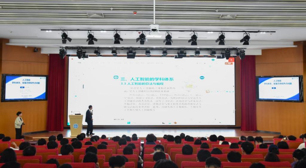 蔡教授从人工智能的起源讲起,逐步深入到其核心要素、学科体系、发展现状及未来趋势,为师生们勾勒出人工智能的宏伟蓝图。蔡教授还分享了个人四十余年人工智能探索之路,在自由提问环节,蔡教授说,“人类能利用自身的智慧防止人工智能危害人类,不会让人工智能脱离人类的管控。“