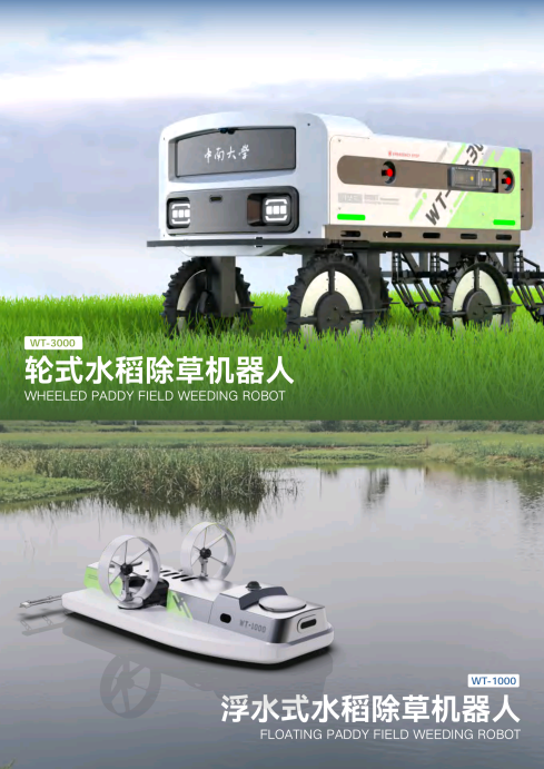牵头,湖南中矿⾦⽲机器⼈研究院和湖南智能农机研究院参与研制的。针对南方丘陵地区水田特点,结合水稻秧苗与杂草的生长特性,设计了驱动转向一体化集成的四轮四驱轮式移动底盘和空气螺旋推进浅吃水平底浮水式移动底盘,实现了水田复杂环境的高适应性灵活行走,并通过翻搅和碾压等实现有效除草任务。项目突破人工智能视觉检测、结合北斗的多传感器精准定位和自主导航等关键技术,助力水稻生产的自动化和智能化发展。