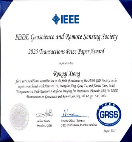 陈溅来副教授及博士生熊蓉琪等发表的IEEE会刊论文《Nonparametric Full-Aperture Autofocus Imaging for Microwave Photonic SAR》,获 2025 IEEE GRSS TGRS Prize Paper Award(全球每年仅 1 项)。