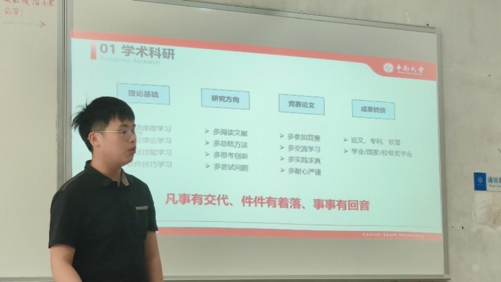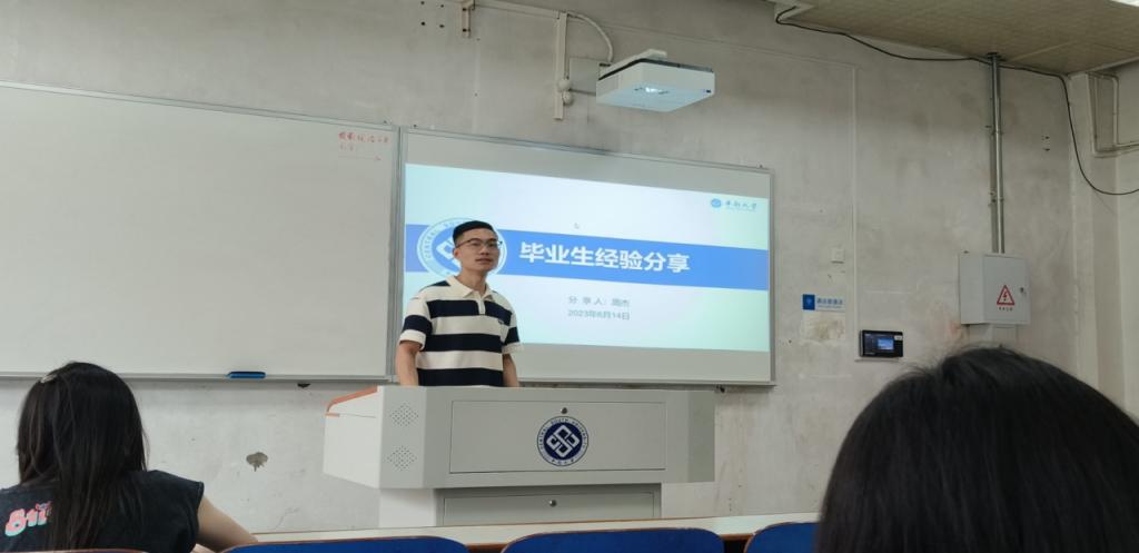 交流环节之后,研四支部毕业生党员周杰、研一支部毕业生党员胡成向全体党员同志分享科研和求职经验。周杰同志从个人和市场两方面剖析就业环境,建议同志们从自身出发制定一份职业生涯规划,从多方渠道建立信息优势,并以意向岗位需求为导向多做准备。胡成同志建议全体党员多参与学院、学校活动,无论就业还是科研都要善于尝试、敢于犯错、积极思考、勇于解决问题,要适当走出去“看世界之大,观万物之奇”,也要引进来“学人之所长,解人之所难”。