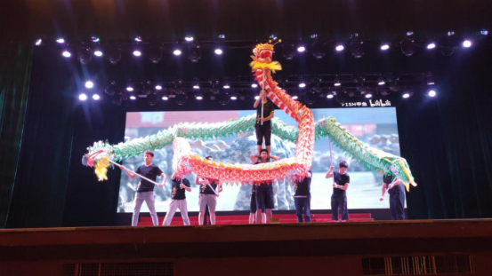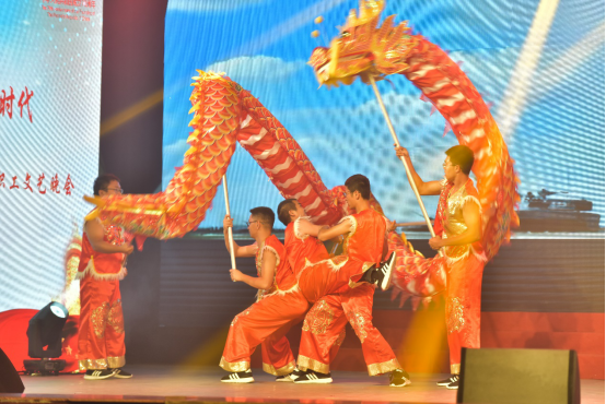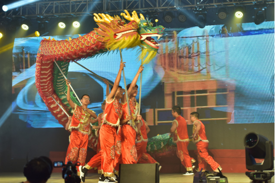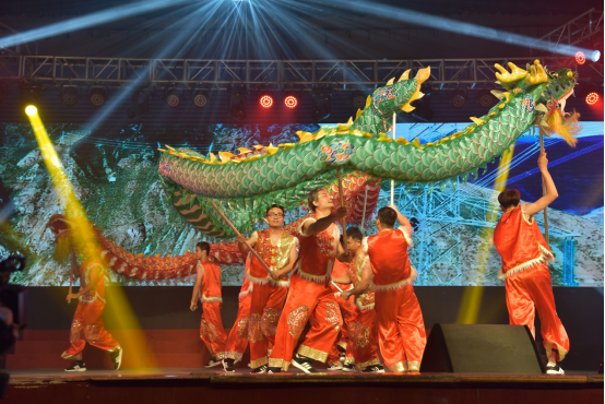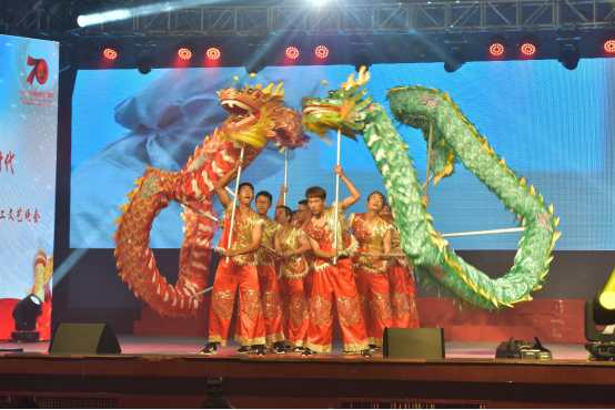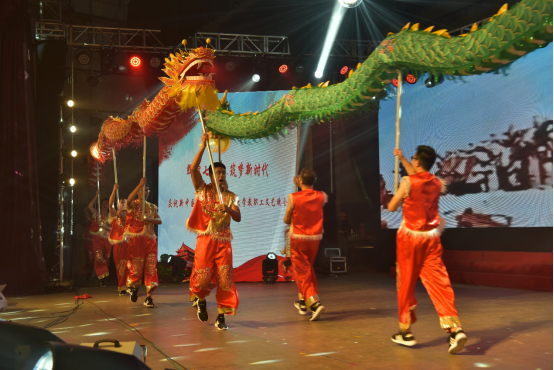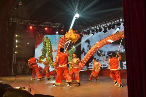 教职工舞龙队在舞台中央舞出了一场龙腾盛世,掀起了晚会高潮。