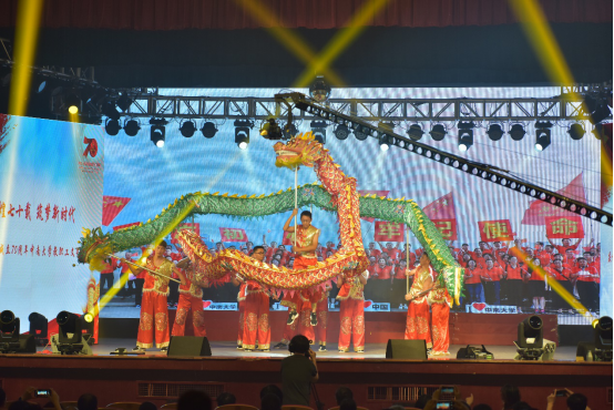 全体教职工身着中国红的院服,在橘子洲毛泽东浮雕前高举“不忘初心,牢记使命”的标语以及摆出的“70”的字样。这幅龙腾盛世的恢弘场面立即将全场的气氛引爆,现场的掌声与欢呼声经久不息。
