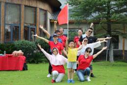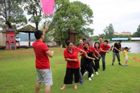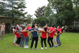 随着拓展训练教官一声令下,团建活动正式拉开序幕。首先我们进行比赛前的放松运动,彼此揉肩、捶背(图2),团结友爱、花开富贵(图3),欢声笑语,快乐无比。然后18位成员分成两个队,选出队长并有自己的队旗、队名与口号。1队摆拍了一个“激情飞扬、壮我前行”的静态图(图4),2队则在“乘风破浪、勇往直前”的口号中演绎着动态变化(图5)。