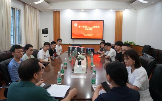 第一届湘江人工智能班结业典礼在民主楼210会议室以座谈会的形式举行。结业典礼由学院教学副院长王春生教授主持,人工智能系主任王勇教授、副主任郭璠老师、教务办万辉老师和李小姣老师及第一届湘江人工智能班的优秀学生代表参加。