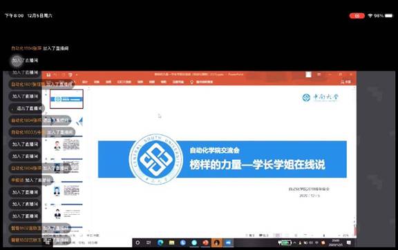2020年12月5日晚,面向禁漫岛 18级学生的学长学姐升学经验分享会自动化测控专场顺利举行。本次经验分享会的形式为线上直播,目的是通过往届优秀毕业生的经验分享帮助面临毕业去向选择的同学学会如何准备与规划升学。参加本次交流会的有10级自动化专业毕业生周小虎、14级自动化专业毕业生邱厚翰、14级自动化专业毕业生李锐、16级自动化专业毕业生黄佩、16级测控专业毕业生马文涛、16级测控专业毕业生高嘉智以及18级全...